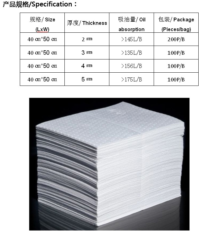 Product use: mainly used in the oil slick, mechanical equipment, oil wiping the sea oil spill recovery processing, gas station, oil tanker, air mail, oil tank, oil drums and other oil spill control to prevent the spread of emergency cleanup.