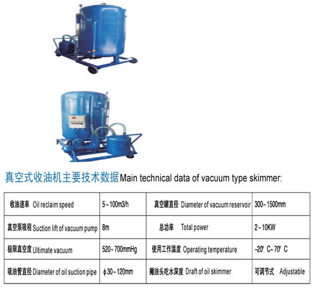 真空收油机是指利用吸入真空泵在真空油罐内制造真空并通过撇油头处的压力差回收油水混合物的装置。适用于回收中、低粘度的溢油;回收能力很强,在港口或岸上较实用。可广泛应用于沙滩、滩岸、礁石、陆地等有溢油需回收的场合,也可用于港湾、油港、码头、河流、湖泊、造船厂、拆船厂、石油、化工、发电厂以及污水处理站等水面有溢油需回收的场合。
