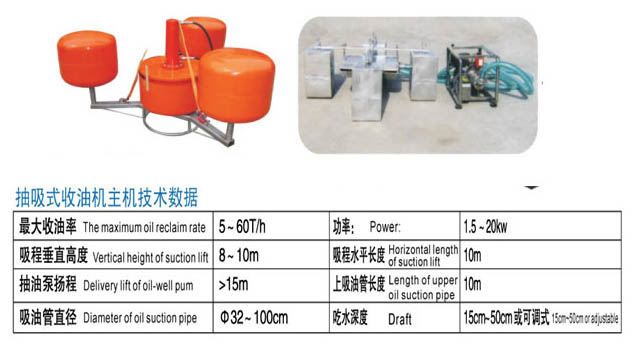 吸入式撇油器结构简单,是一种最常用的油分离器,适用于恢复石油泄漏中,低粘度承压水地区允许波高小于0.5米。它有许多优点,如体积小,重量轻,维修方便,回收效率高,易于更换的分离器组件。