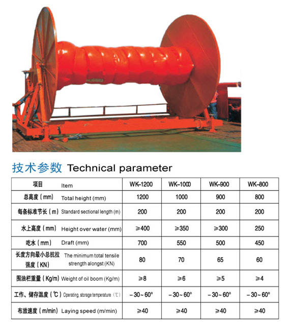 Its main body is heavy polyurethane, soft cloth or polyvinyl chloride and upper independent floating body, consists of 2 layers of polyurethane or polyvinyl chloride, the skirt shaped center part is made of polyurethane or polyvinyl chloride, and the lower part is wrapped with counterweight chain. The parts are interconnected, the quick couplings and the counterweight chains are joined to the yoke. In addition, each reel is equipped with 2 tractor devices. Each arm length can be made as required; if not, the default length is 50, each 200 meters reel.