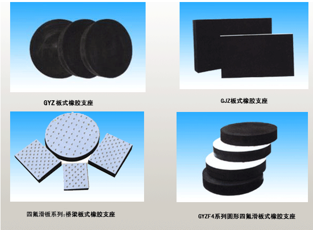 GYZF4系列橡胶支座:该支座在GYZ系列支座上按支座表面尺寸粘复一层2~4mm厚的聚四氟乙烯板(F4)而成。除具有GYZ系列支座的所有功能外,由于它利用F4板与梁底不锈钢板之间的低摩擦系数,使上部构造的水平位移,不受支座本身剪切变形量的限制,能满足一些桥梁的大位移量需要。